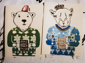with a placard and trying to find a mate. My sister Lisa was at this workshop and at the beginning she said to me ‘You like to use animals’. ‘Yeah, because everyone can see themselves in them’, I replied. I wanted to have a card that people could customize in their own way but also give to anyone who would identify with it. We had a Hanukkah sweater, a Christmas sweater with trees and reindeer, a winter sweater in the Pan-African colors for Kwanzaa, and a Star Wars themed sweater for the rest of us. There were stamps of different hats and people made their own for the placard area, candles, coffee cups, hearts, the word Joy. We all got to make cards to give out that were handmade and personal, fun and meaningful, a good expression of what we call the holiday spirit, a communal act of giving and celebration.